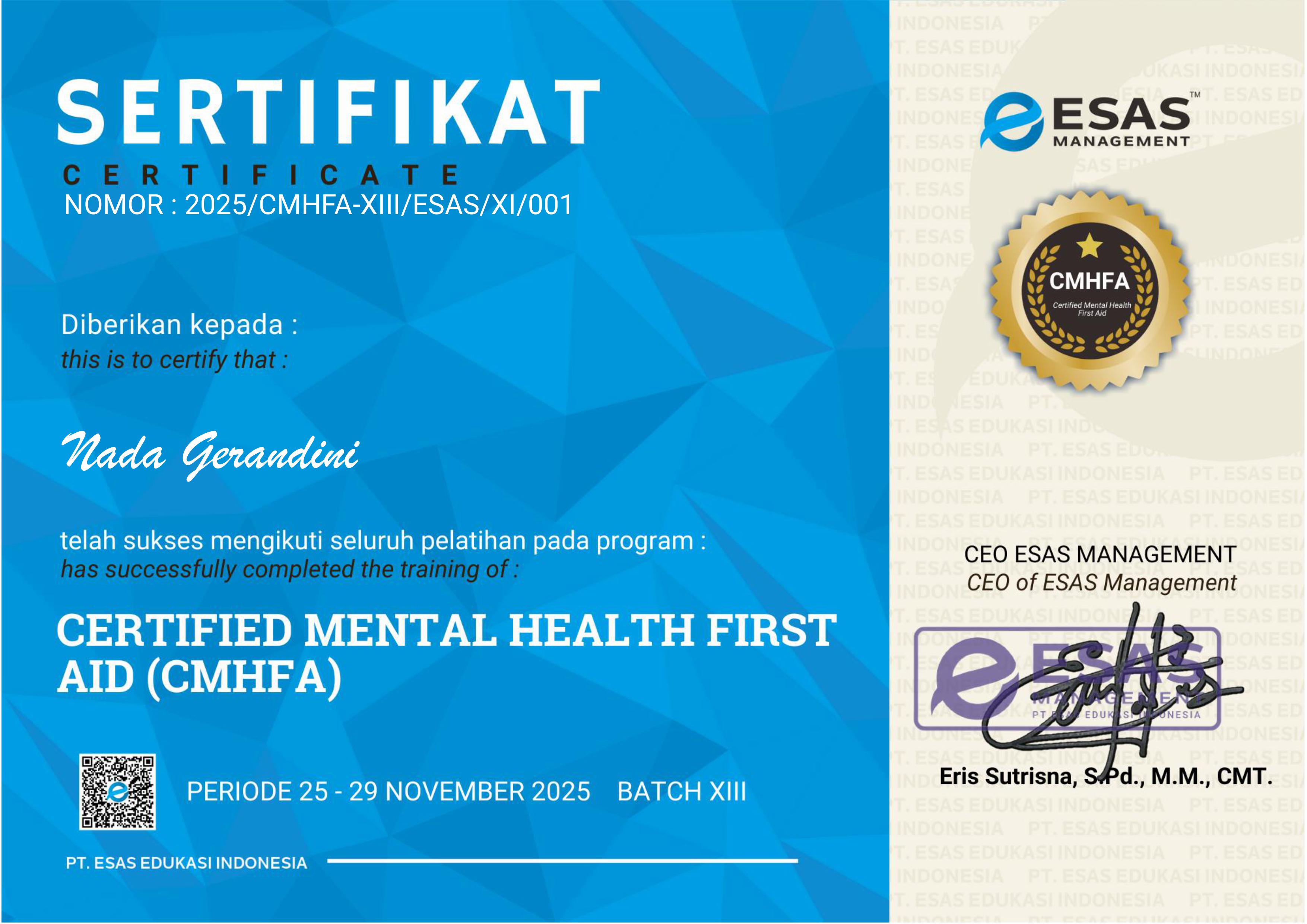 Nada Gerandini adalah seorang Corporate Trainer dan Consultant di bidang Leadership, Motivation, Customer Experience, dan People Development yang berpengalaman melatih berbagai organisasi di sektor korporasi, pemerintahan, hingga startup. Dengan latar belakang kuat dalam pengembangan sumber daya manusia dan strategi bisnis, Nada dikenal sebagai fasilitator yang mampu mengubah pembelajaran menjadi transformasi nyata dalam kinerja individu dan organisasi.